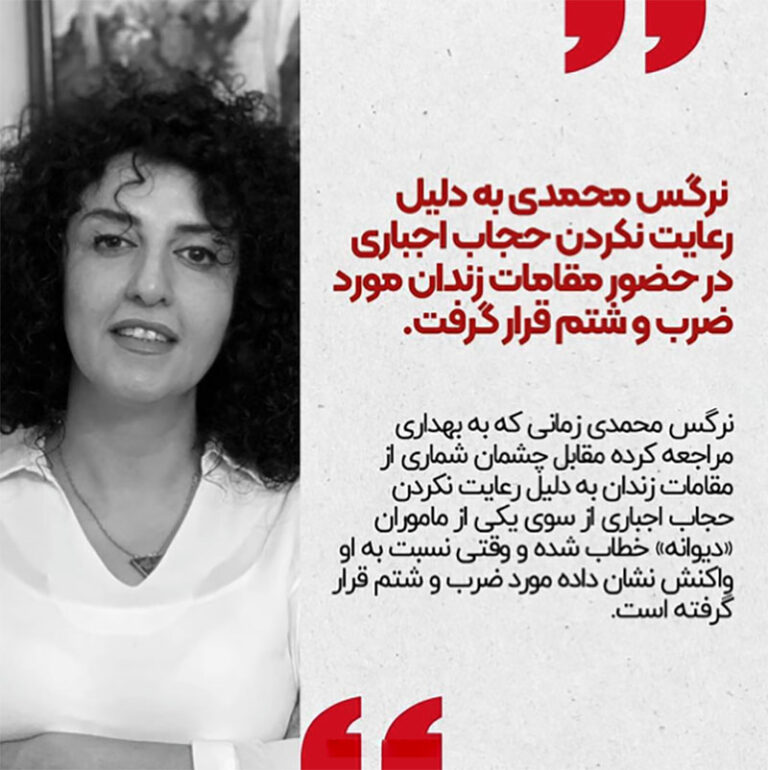 بر اساس گزارشی که در صفحه اینستاگرام نرگس محمدی منتشر شده، «ضرب و شتم و توهین» این زندانی سیاسی در روز دوشنبه ۲۰ شهریور به علت «نپوشیدن حجاب اجباری در حضور مقامات زندان» بوده است.